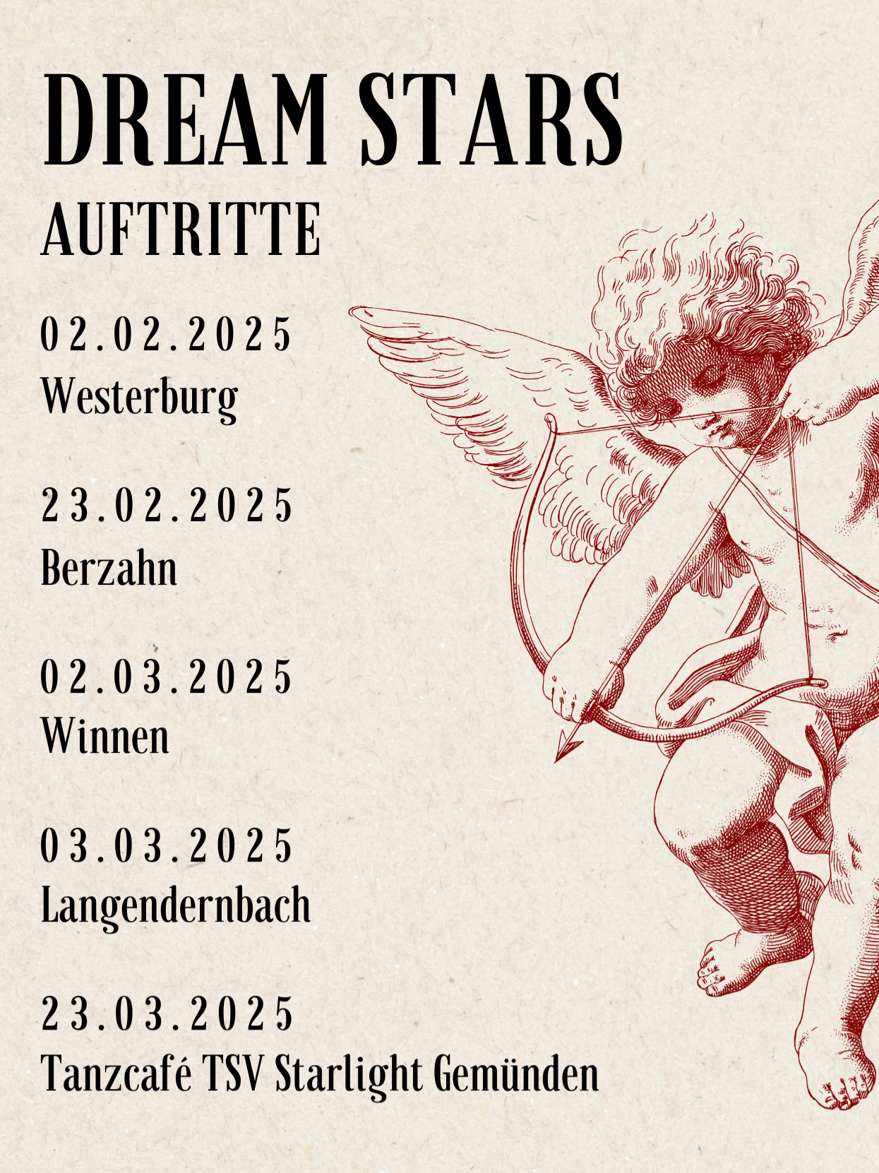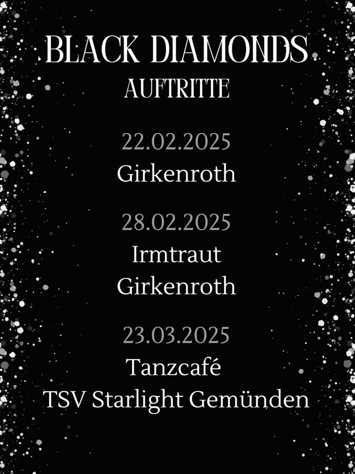 Der Tanzsportverein Starlight 2003 Gemünden lädt ganz herzlich zum Tanzcafé am Sonntag, den 23. März ins DGH Gemünden ein. Einlass ist um 13.30 Uhr, das Programm beginnt um 14.30 Uhr. Der Eintritt ist frei.